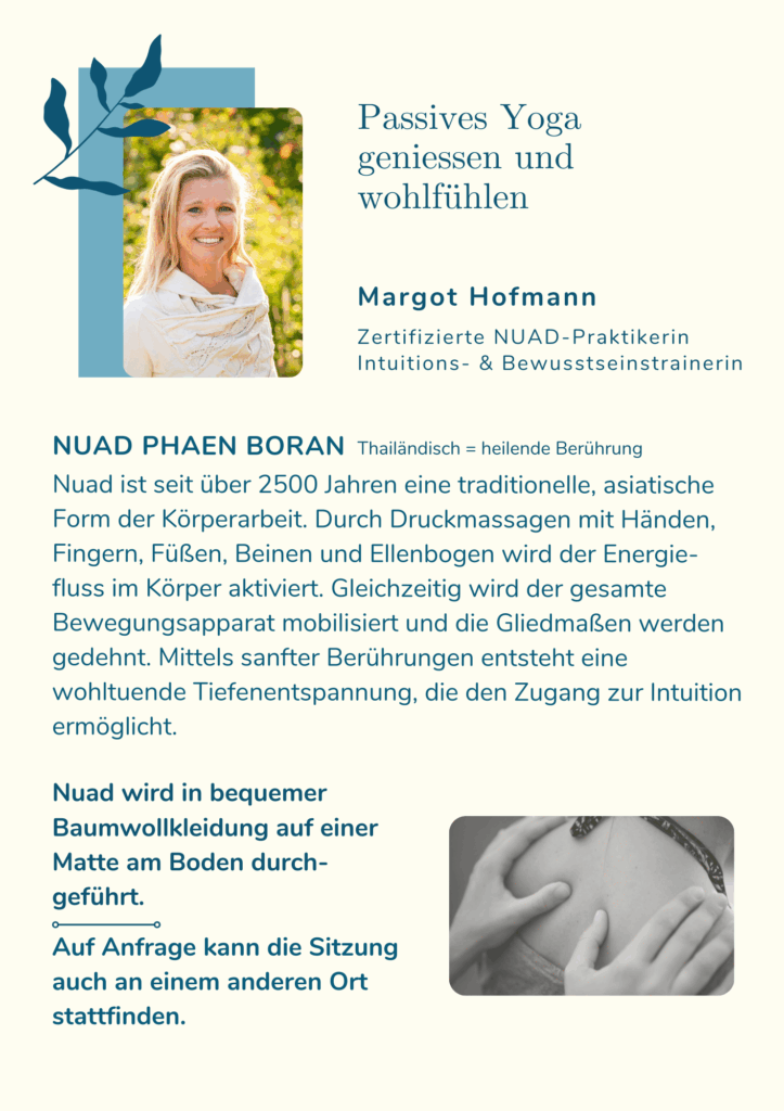 Zeit für dich PASSIVES YOGA mit Margot in den Räumlichkeiten von Qi-Art, Klostergasse 15, 2340 Mödling Auf Anfrage in anderen Räumlichkeiten oder bei dir zuhause.
